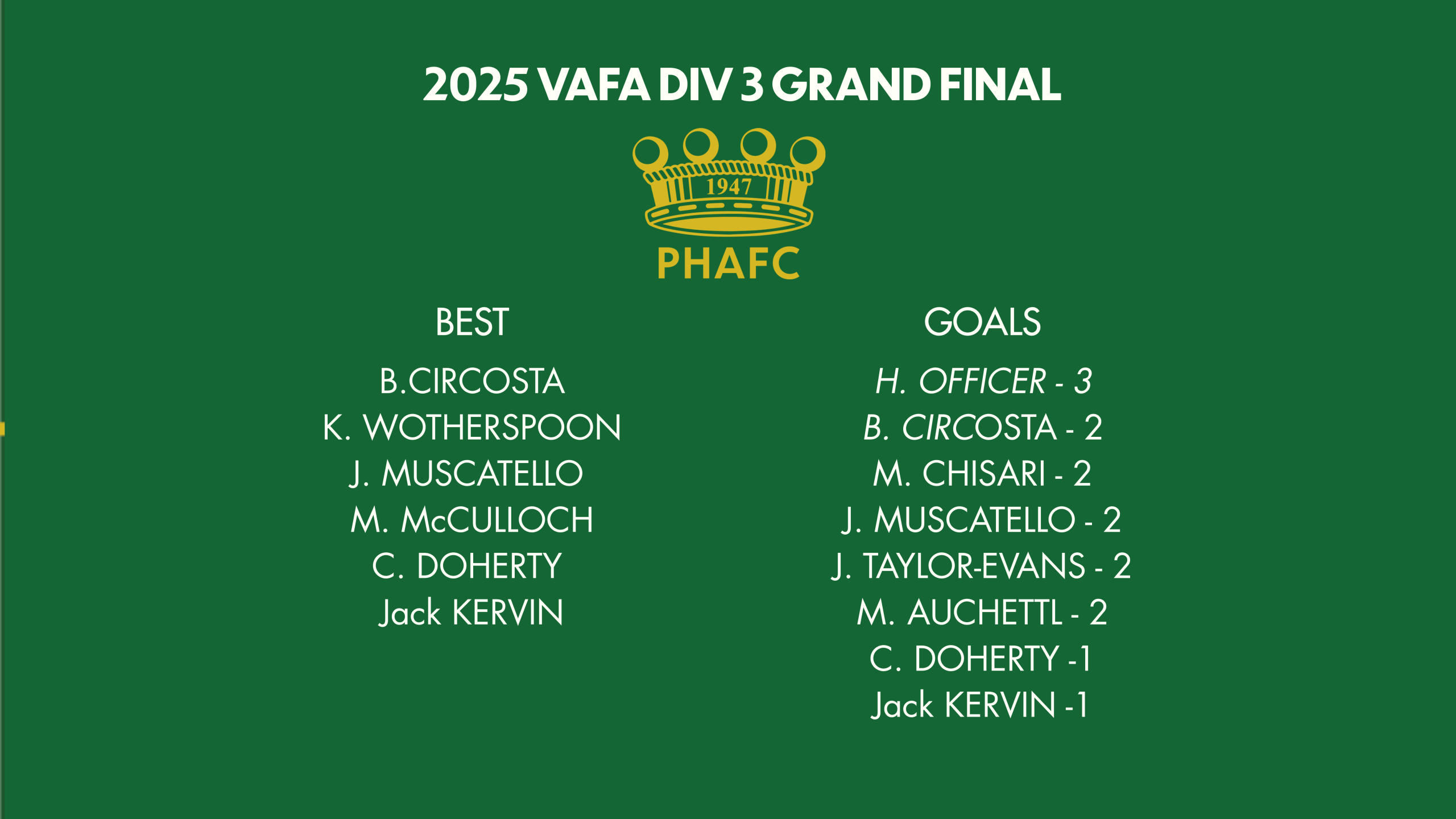 Up against a physical North Brunswick outfit, The House brought manic pressure from the first bounce, holding the Bulls scoreless into a blustery wind and then restricting them to just two behinds in the second quarter to take a three‑goal lead into half time. Kicking with the wind in the third, Power House put on a clinic, piling on goal after goal to have the result all but sealed by the final break. An 8.6 to 0.1 third term was enough to put the game beyond doubt and deliver a famous premiership for the club.